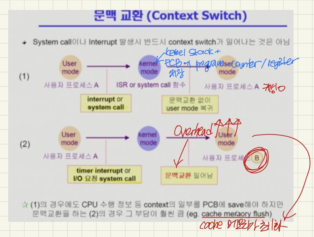 - 프로세스A의 시스템 콜로 CPU 제어권이 프로세스A에서 커널로 넘어갔다가 다시 프로세스A로 돌아오는 경우는 문맥 교환이 일어나지 않는다. 이 경우에는 프로그램A의 PCB이 캐싱되어있기 때문에 커널 모드에서 유저 모드로 전환하는 과정에서 오버헤드가 발생하지 않기 때문이다.